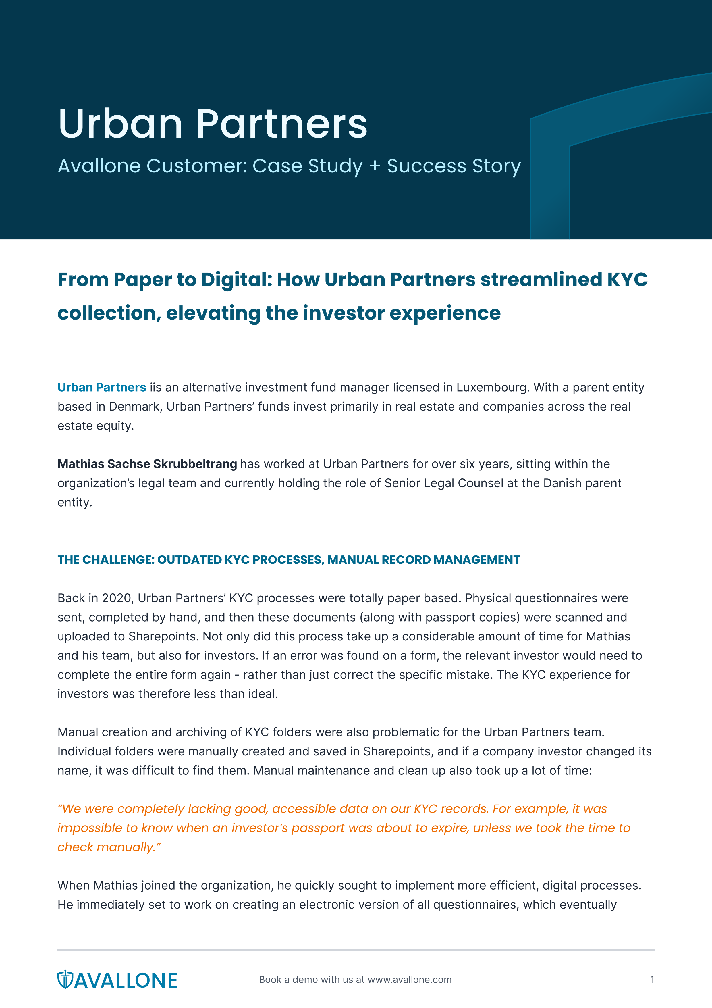 Interview the organisation’s finance and legal team to explore the ways in which using Avallone has boosted their KYC operations. Following the interview, I created a case study for Avallone.